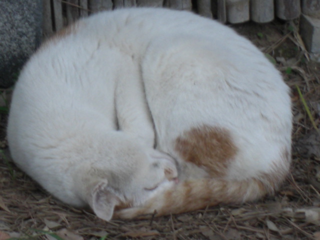 「チッ!猫にまで見せ付けられるとはな!」と、クサクサしながら(尤もここの猫達はみんな仲良しで、寒い日はよくこうして何匹かで重なって、巨大な毛玉になってるんだけど)園内をぶらぶらしていたら、先週ラーメンを食べた帰り、僕から漂う尋常じゃないニンニク臭に、思わず逃げて行った白地に茶ブチの子