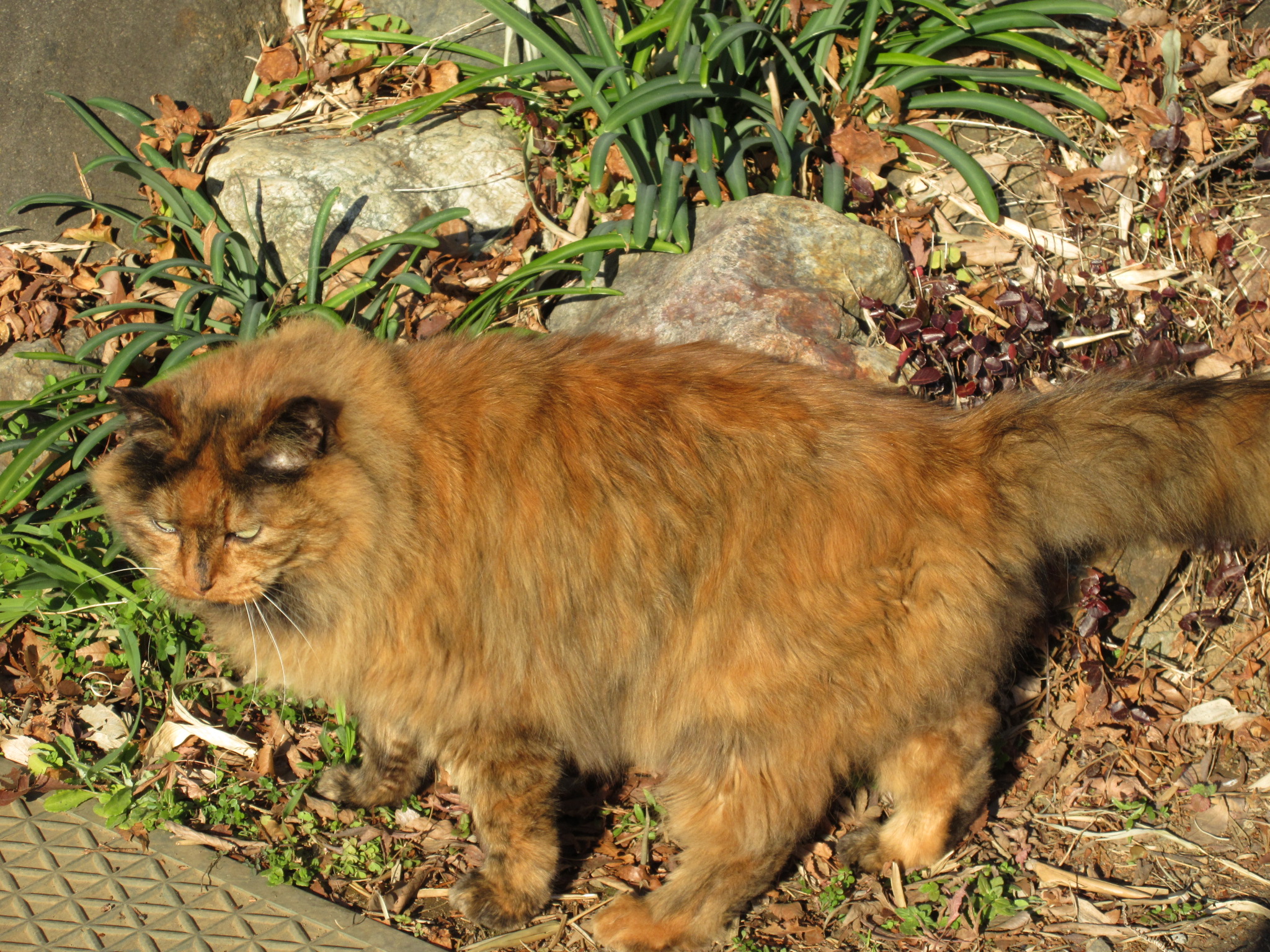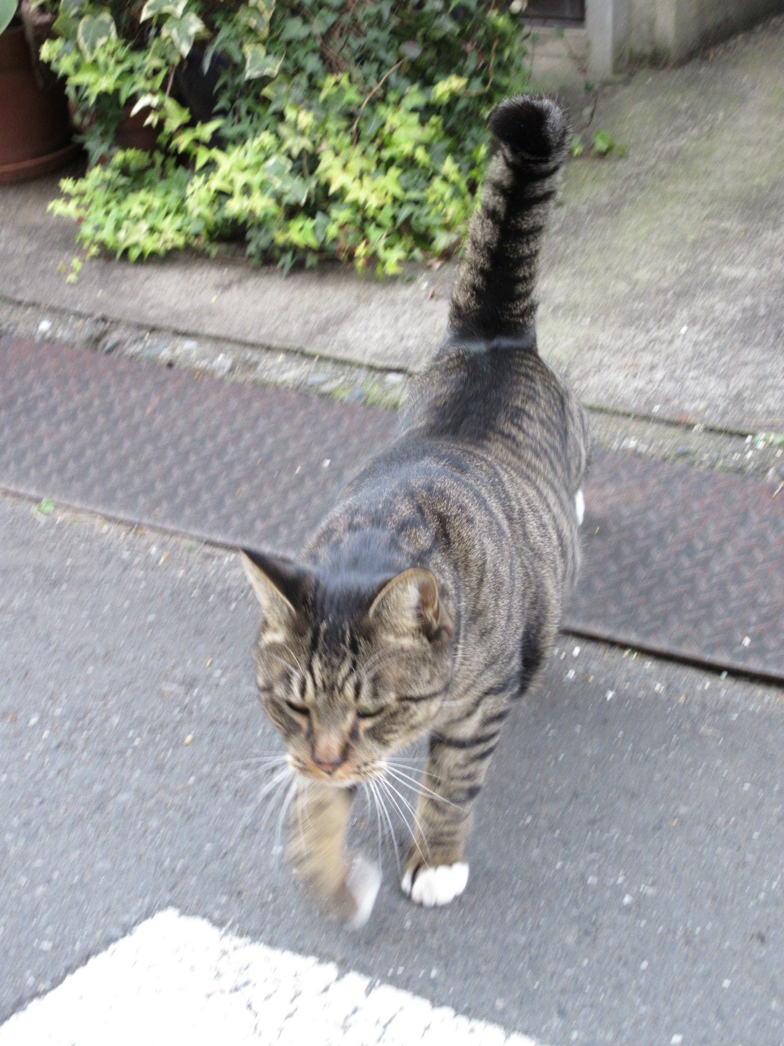 その途中、何度も何度も「はぁ~…」と、まるで200mを全力で走った後の人の呼吸レベルで溜め息を吐いていたら…先日書いた、3人のお年寄りをメロメロにしていたキジトラの猫(♀)が、ある民家の前で座っているのを発見。