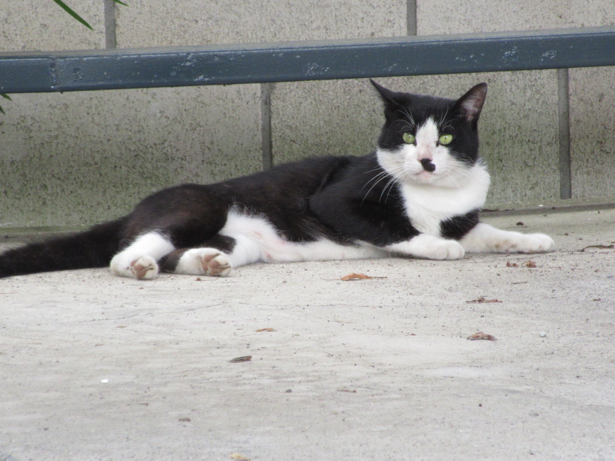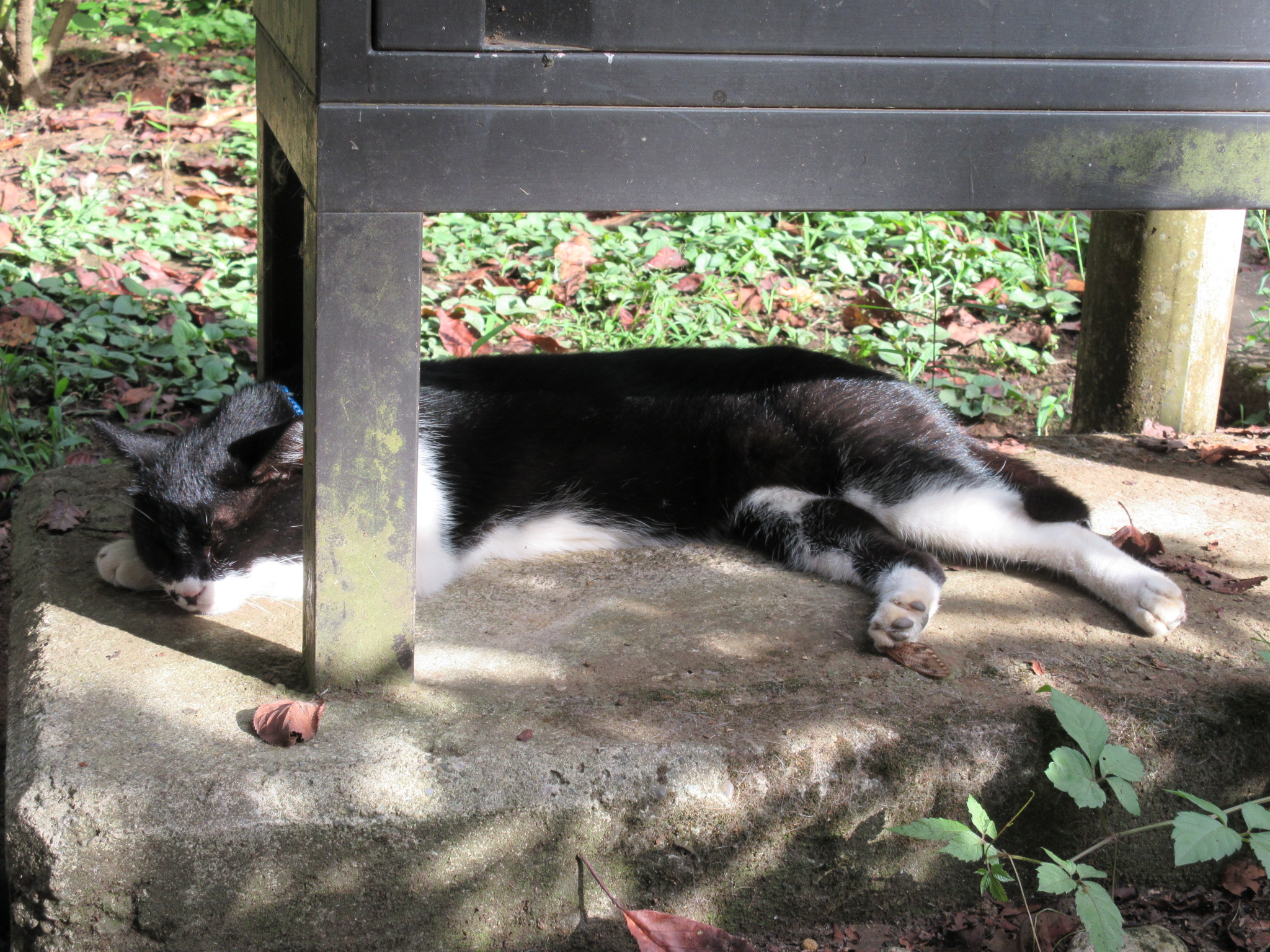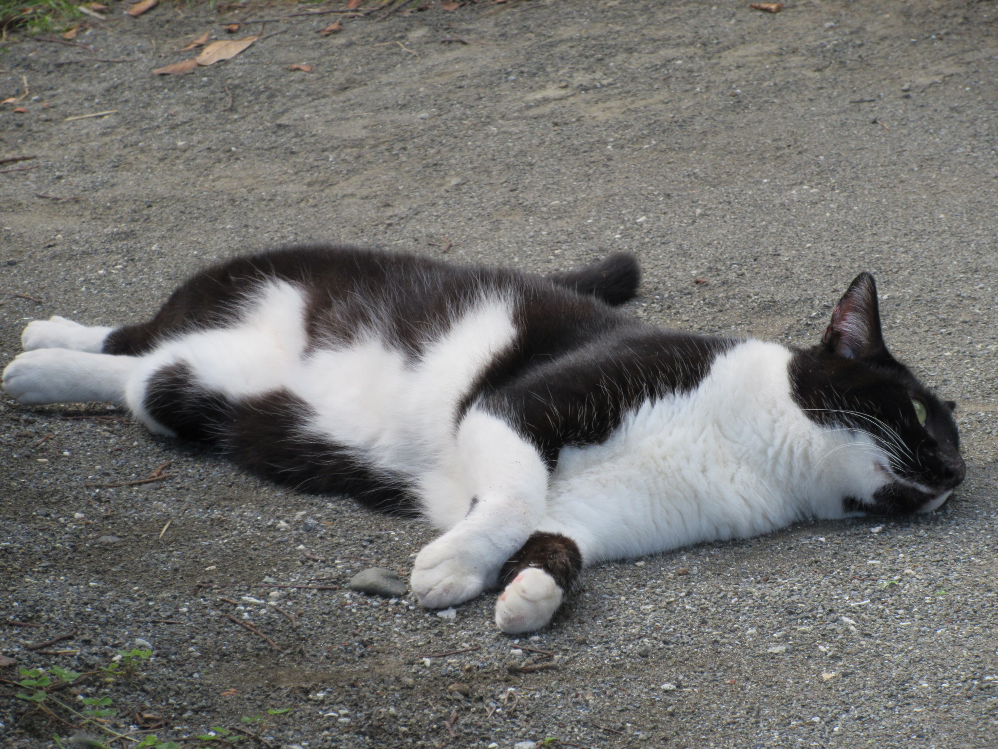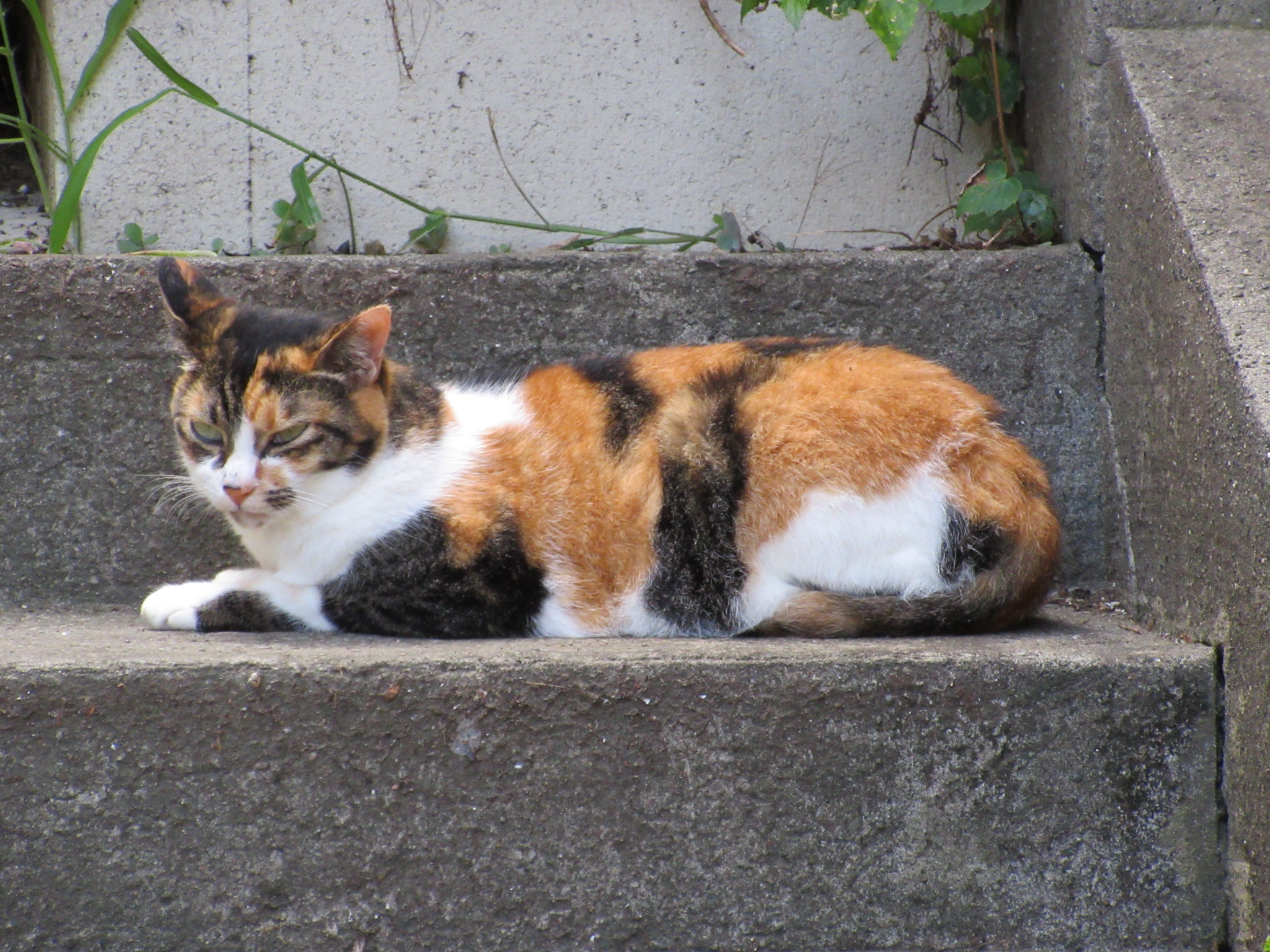 僕が通りかかった時、階段の下の日陰でこの人が「くた~」っと倒れていたけど、写真を撮ろうとカメラを出していたら起き上がって「にゃー」って鳴いて…ん?「鳴いて」?… あ、猫だった。