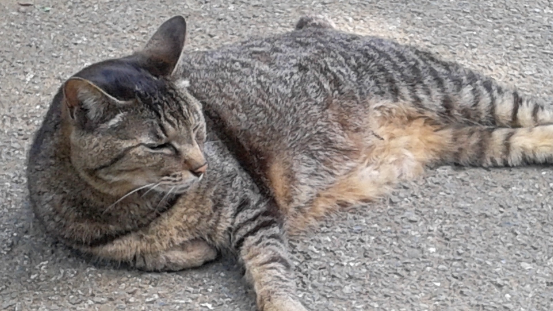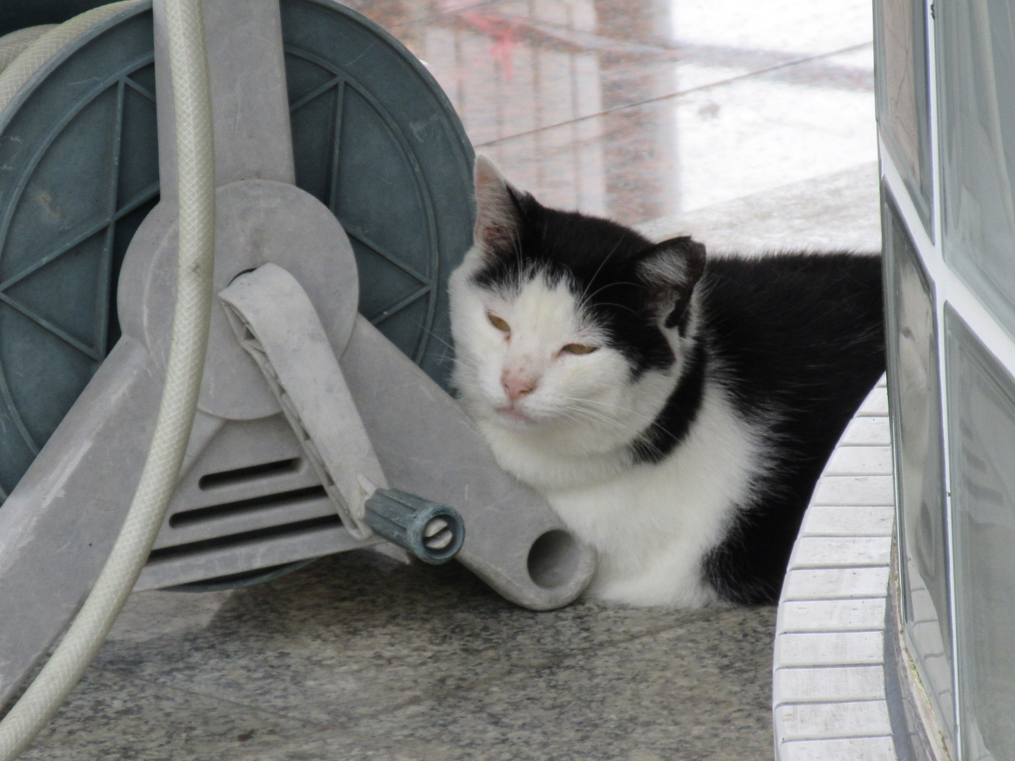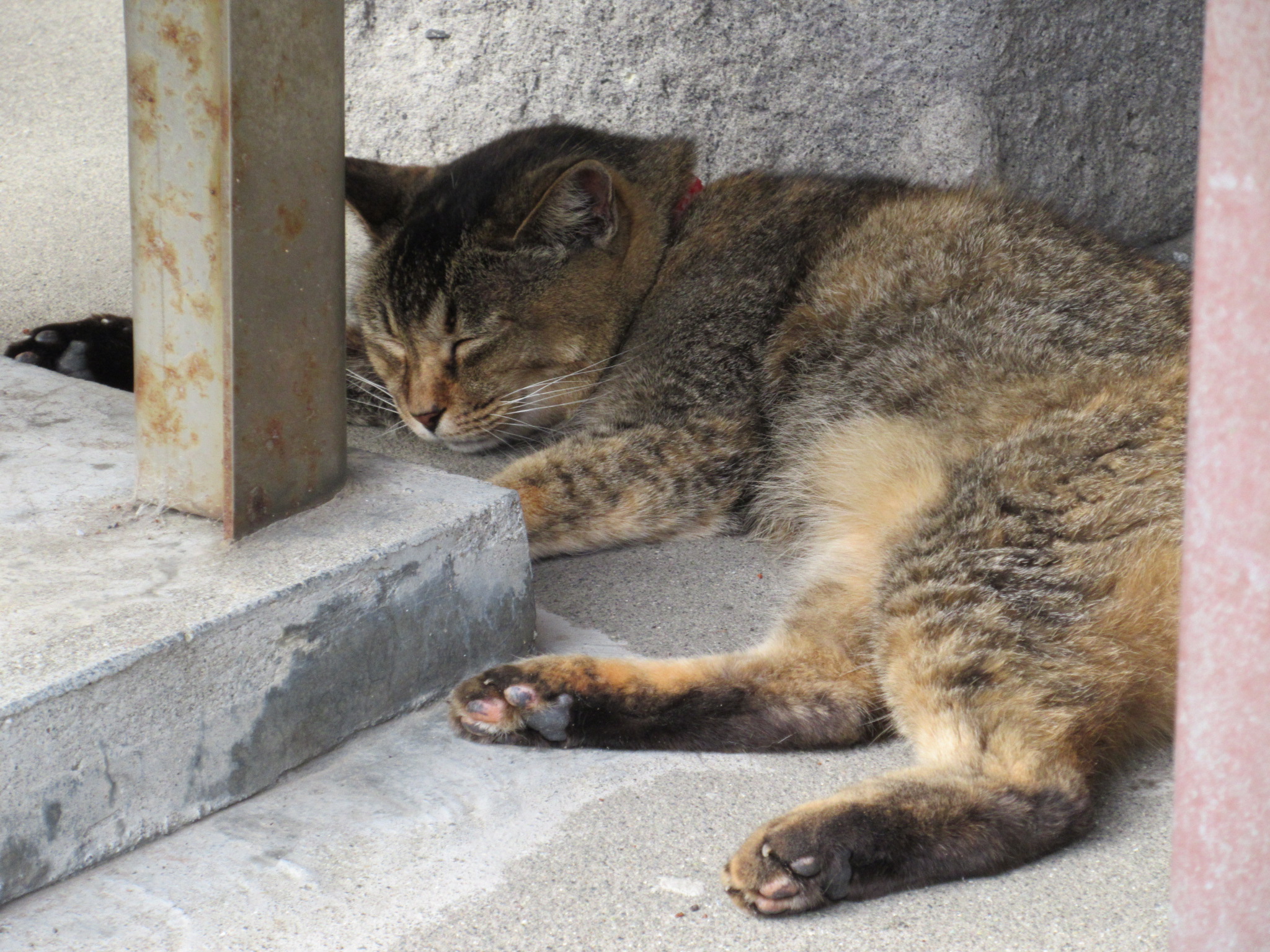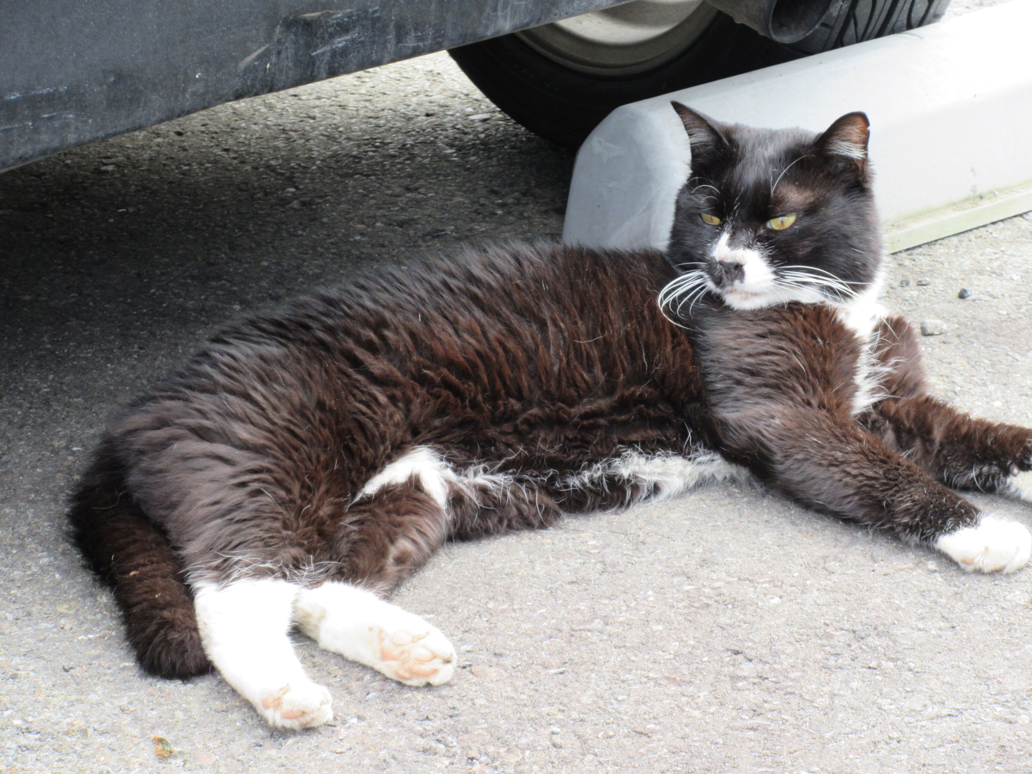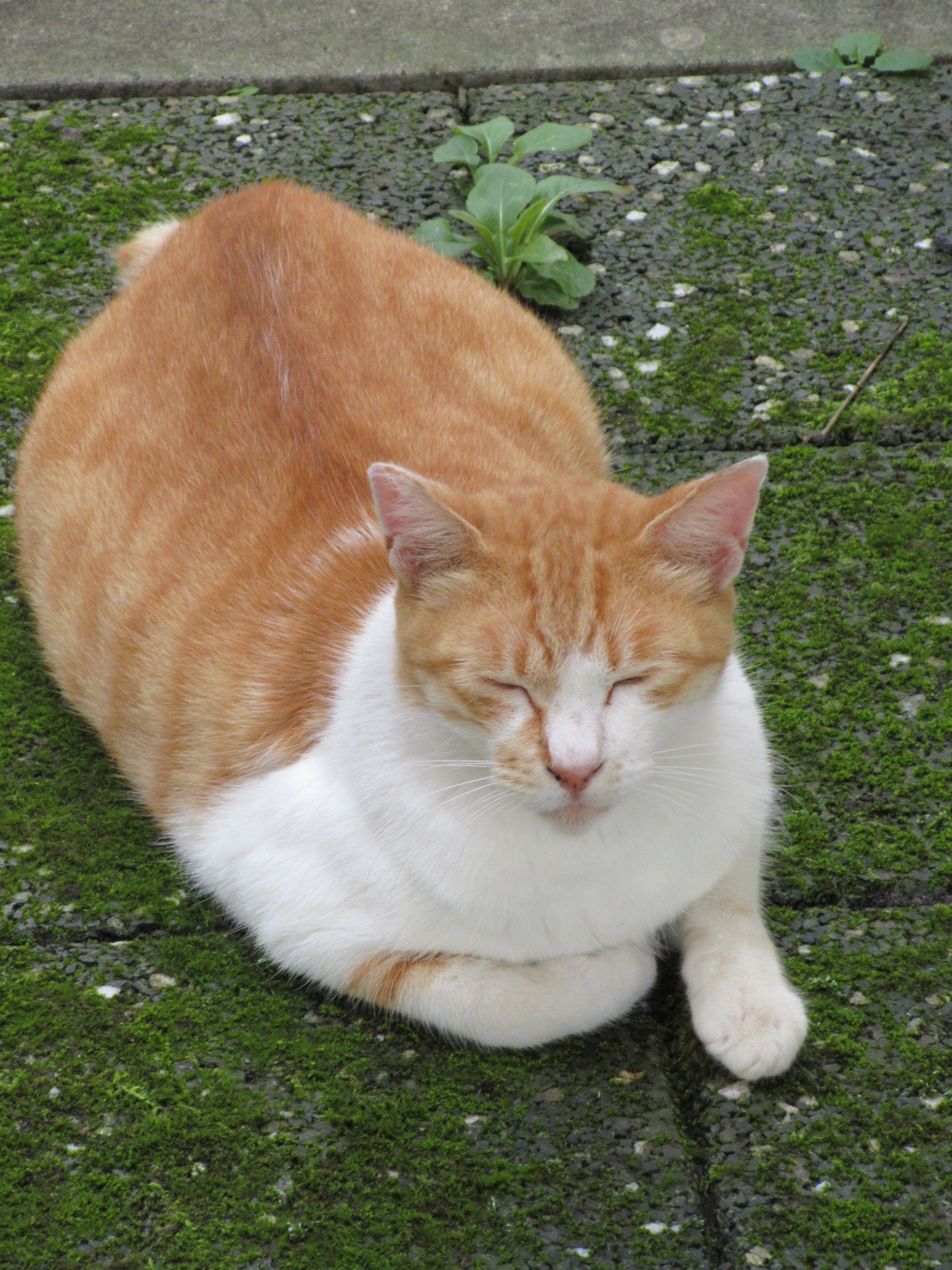 僕が通りかかった時、階段の下の日陰でこの人が「くた~」っと倒れていたけど、写真を撮ろうとカメラを出していたら起き上がって「にゃー」って鳴いて…ん?「鳴いて」?… あ、猫だった。