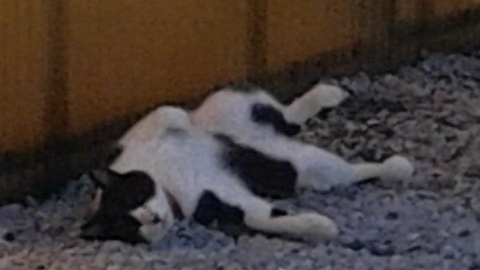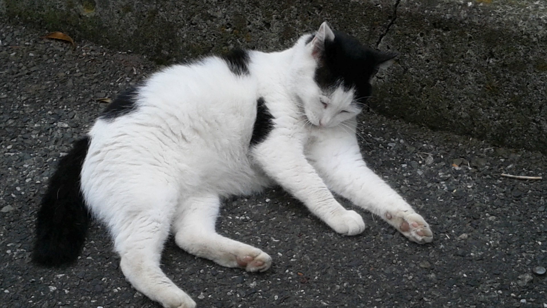もっと他にも横になる場所はあっただろうに、わざわざ人目につきやすい道路に面した所で昼寝するサービス精神…!