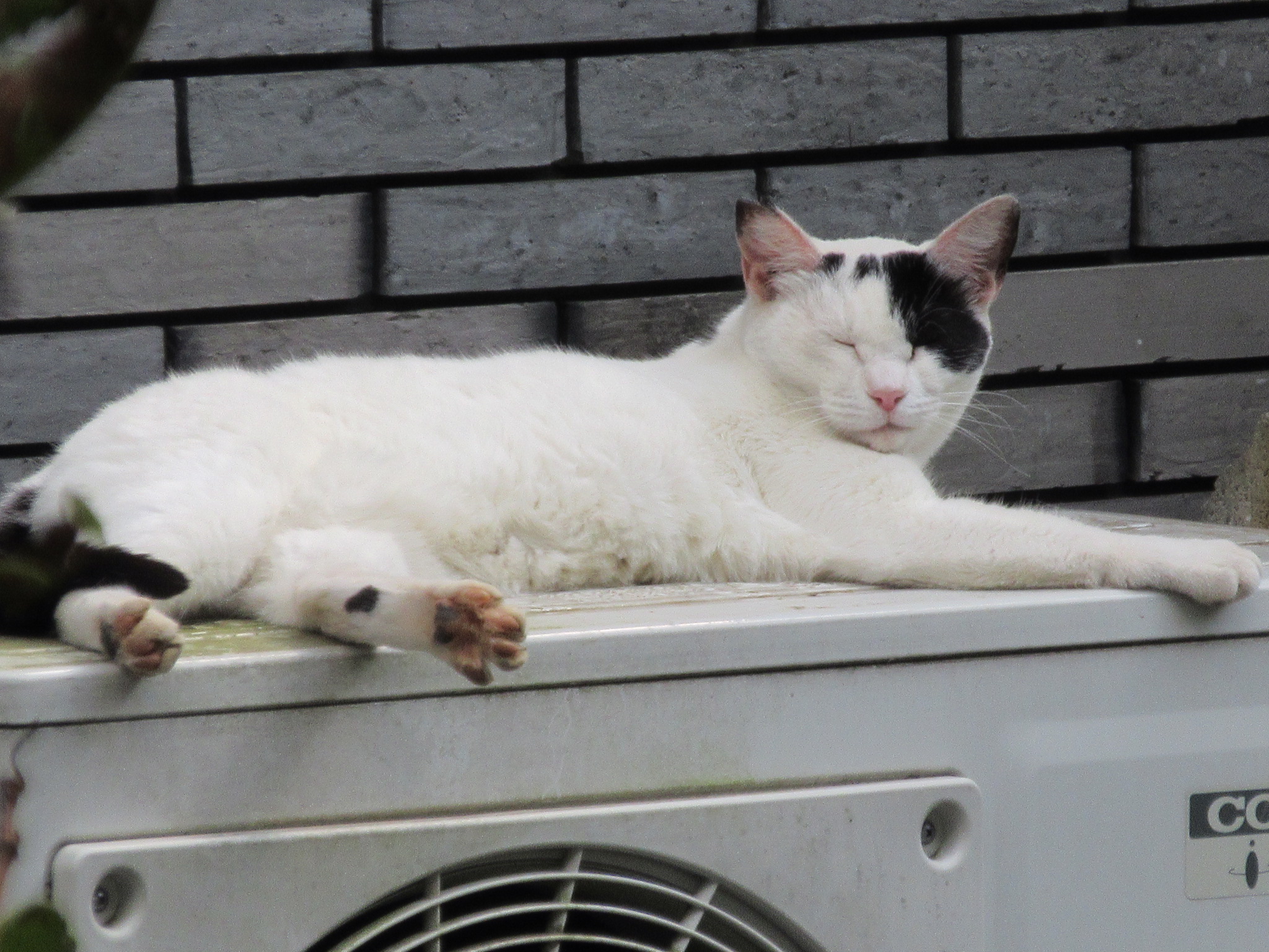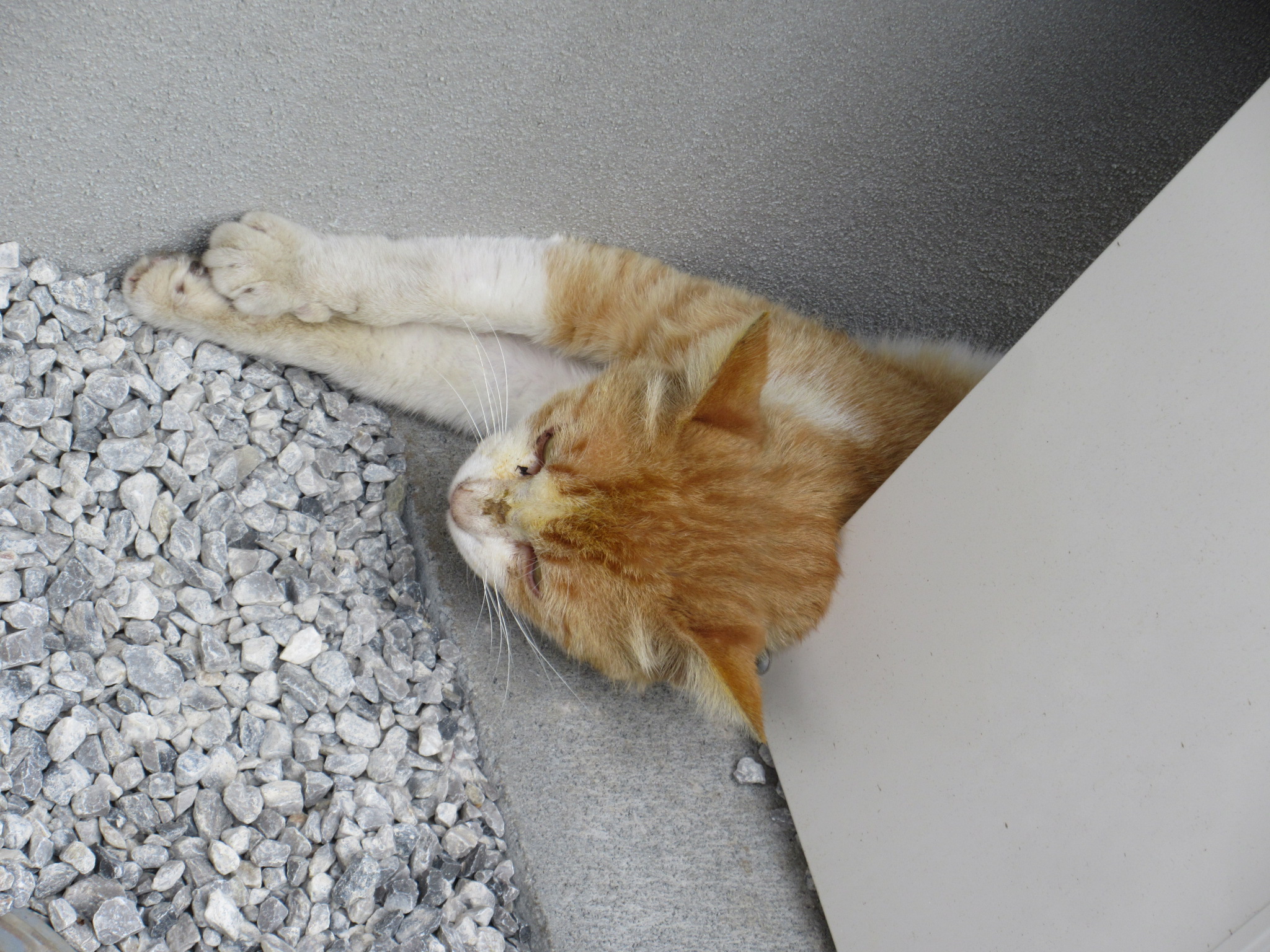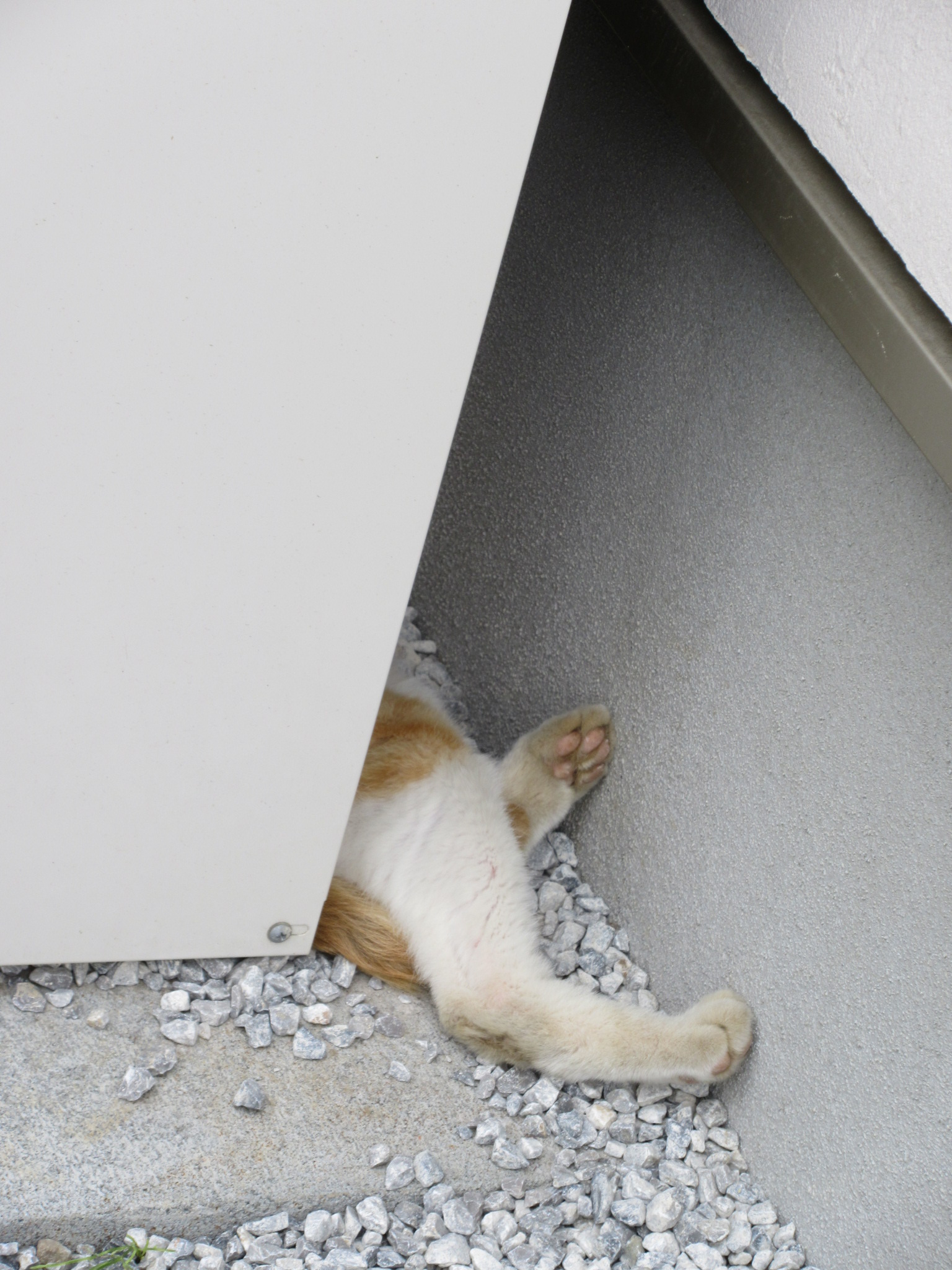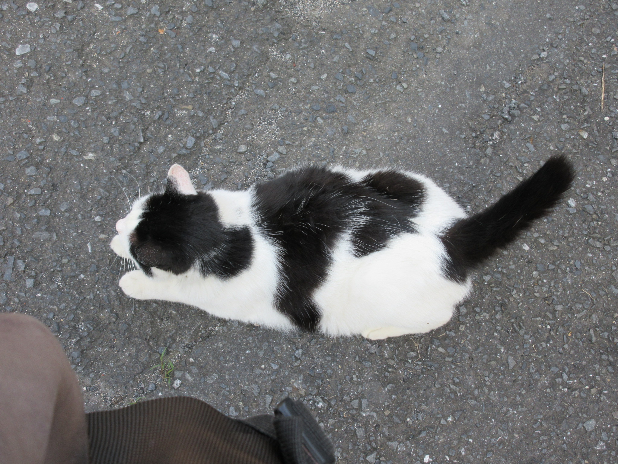 …周りの参拝客の奇異な視線をものともせず、10分近く猫をかまった(かまってもらった)後ようやく本殿へ行って参拝を済ませ、持って来た掛け軸を社務所に納めて駐車場に向かったんだけど、途中、さっきの猫の様子を見に行ったら…2人の女性客を相手に、片足を思い切り天に向かって突き上げるというセクシーポーズでサービスしていた…!