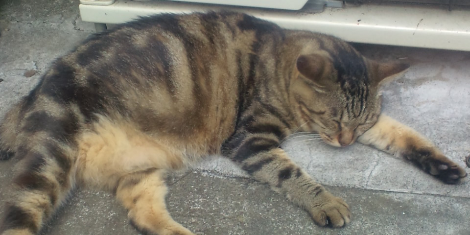 今日、外をブラブラしていた時。あるアパートの駐車場に停めてある車の下に茶トラの猫が頭だけ出して昼寝しているのが見えたから、「よし!『新種のヤドカリ発見!』ってタイトルで日記に写真を載せよう!」と、カメラを持って近寄ったら、僕がしゃがんだ瞬間に目を覚まして!そして僕の脛に体をスリスリとこすり付けて来た!!!!!!!!!