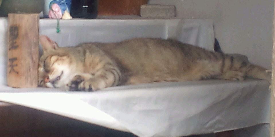 ある公園の小さなお社の中で御神体然として昼寝中の猫!